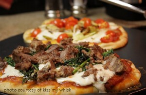 Preheat oven to 350 to 400, using the higher temperature if you like a crispier pizza. Drizzle olive oil and sprinkle salt and pepper onto zucchini and onion. then place onto heated grill and grill for 8 to 10 minutes, turning once. Set aside until ready to assemble pizza. Meanwhile cook spinach and garlic over medium heat on the stove. Grill both sides of naan bread for 3-5 minutes (this is when you should go ahead and sneak some bites in of the grilled zucchini because it tastes so good)