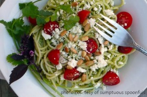 Cook the pasta. While the pasta is cooking, in a handi chopper or food processor, blend together the cucumber, avocados, garlic, lemon juice, tahini, and herbs. Add salt & pepper to taste. (Take it easy on the salt if you’re adding salty feta on top.) Drain the water from the pasta and toss it with as much sauce as you feel is needed. (Save the rest for a dip or another use.) Top with halved cherry tomatoes, feta cheese crumbles, toasted pinons and garnish with fresh cilantro and/or basil. Enjoy!