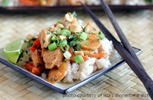 Cut vegetables and chicken, set aside. In a small bowl, combine peanut butter, lime juice, soy sauce, vinegar, sriracha, garlic powder and black pepper. Whisk together until well combined and smooth. It will look lumpy at first, but as you whisk, it will get nice and creamy. Stir in cilantro. Heat oil in a wok or large skillet over high heat until oil is very hot. Add chicken and stir fry for about 3 minutes, until chicken is no longer pink. Move chicken to the sides and add green onions, stir fry for 1 minute.