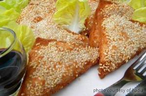 Remove the crust from the bread. In a food processor, place the shrimp, egg, soy sauce, fish sauce, salt, vinegar and chili pepper if used. Process until the mixture is smooth. Spread one tablespoon of the mixture onto each white bread, covering the middle and edges as well. Cut each slice of bread into two triangles. Place the sesame seeds on a plate. Dip the bread (shrimp side down) into the sesame seeds. In a heavy bottomed saucepan, heat up the oil to an adequate frying temperature.