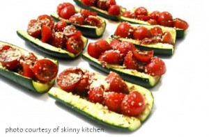 To Prepare Zucchini Boats: Preheat oven to 400 degrees. Line a baking pan with foil. Cut each zucchini in half. Using a small spoon or melon baller, scoop out middle section of the zucchini halves to form a boat, leaving a thin shell on each half. Cut each piece in half again. This will make 16 pieces. Place on baking sheet. Spray with olive oil spray. Sprinkle each with a little salt, pepper and garlic powder. Bake for 15-20 minutes until soft.