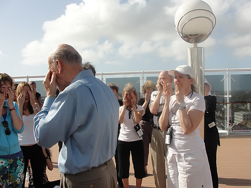 Lino Stancich instructs passengers on the art of self-massage for healing on the top deck of the MSC Poesia.