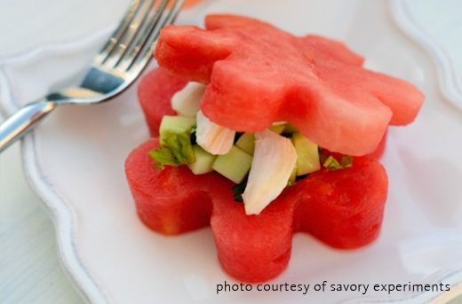 - Cut watermelon into 1 1/2 inch slices. Cut center with a cookie cutter, shape of your choice, but make sure the center has enough space that you can hollow out a small hole to hold 2 tablespoons of crab meat mixture. You will need at least 4 cut-outs. Reserve the rest for snacking.