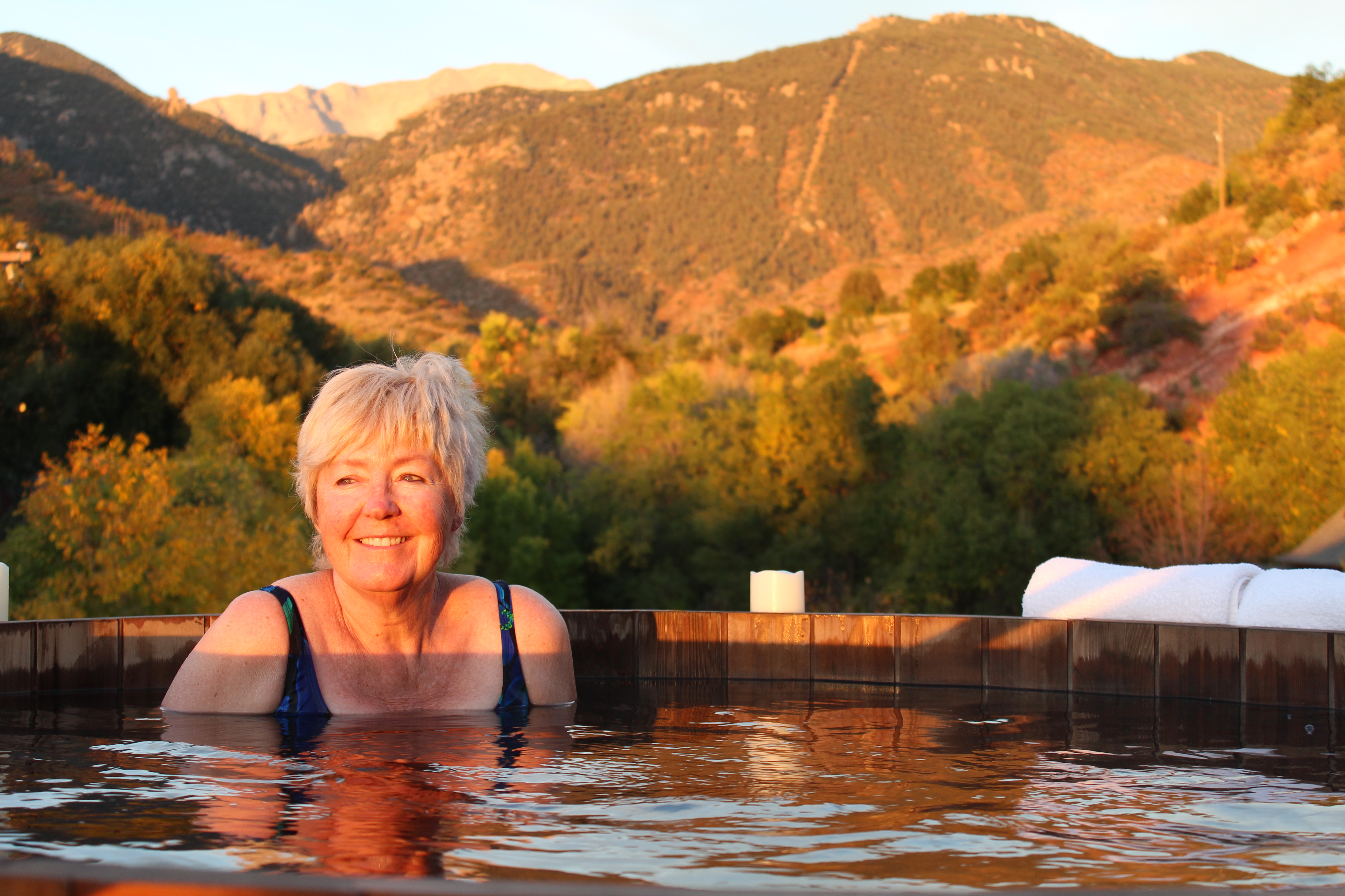 My husband and I paid a visit this past summer to experience the healing waters ourselves. Upon arriving on property we were seduced by the splendid views of Tava Mountain (Pike’s Peak). To enter SunWater Spa you climb a Chakra staircase (you ascend the chakras as you climb the stairs) to the reception area and yoga studio, which has garage-style doors opening to the outside. From here, guests have access to the tubs.